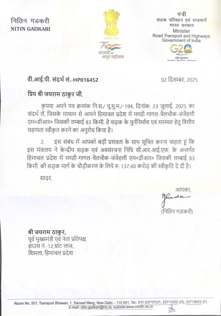 डेली हिमाचल न्यूज़ – मंडी : हिमाचल प्रदेश के मंडी जिला के लिए एक बड़ी और बहुप्रतीक्षित सड़क परियोजना को केंद्र सरकार से मंजूरी मिल गई है। मंडी-गग्गल-चैलचौक-जंजैहली सड़क मार्ग के चौड़ीकरण एवं सुधार कार्य के लिए 137.40 करोड़ रुपये की वित्तीय स्वीकृति प्रदान की गई है। इस संबंध में केंद्रीय सड़क परिवहन एवं राजमार्ग मंत्री नितिन गडकरी द्वारा स्वीकृति पत्र जारी किया गया है। केंद्रीय मंत्री नितिन गडकरी ने यह स्वीकृति पत्र पूर्व मुख्यमंत्री एवं नेता प्रतिपक्ष जयराम ठाकुर को जारी किया है। पत्र में बताया गया है कि हिमाचल प्रदेश में मंडी-गग्गल-चैलचौक-जंजैहली एमडीआर सड़क, जिसकी कुल लंबाई लगभग 83 किलोमीटर है, के चौड़ीकरण के लिए केंद्रीय सड़क एवं अवसंरचना निधि (CRIF) के अंतर्गत यह राशि स्वीकृत की गई है।